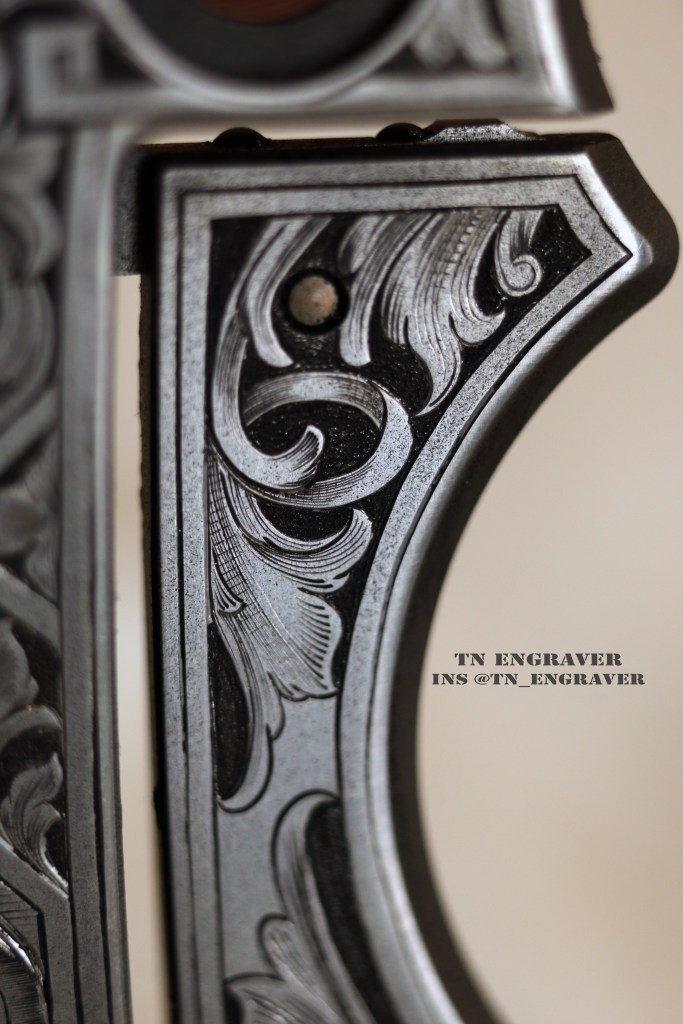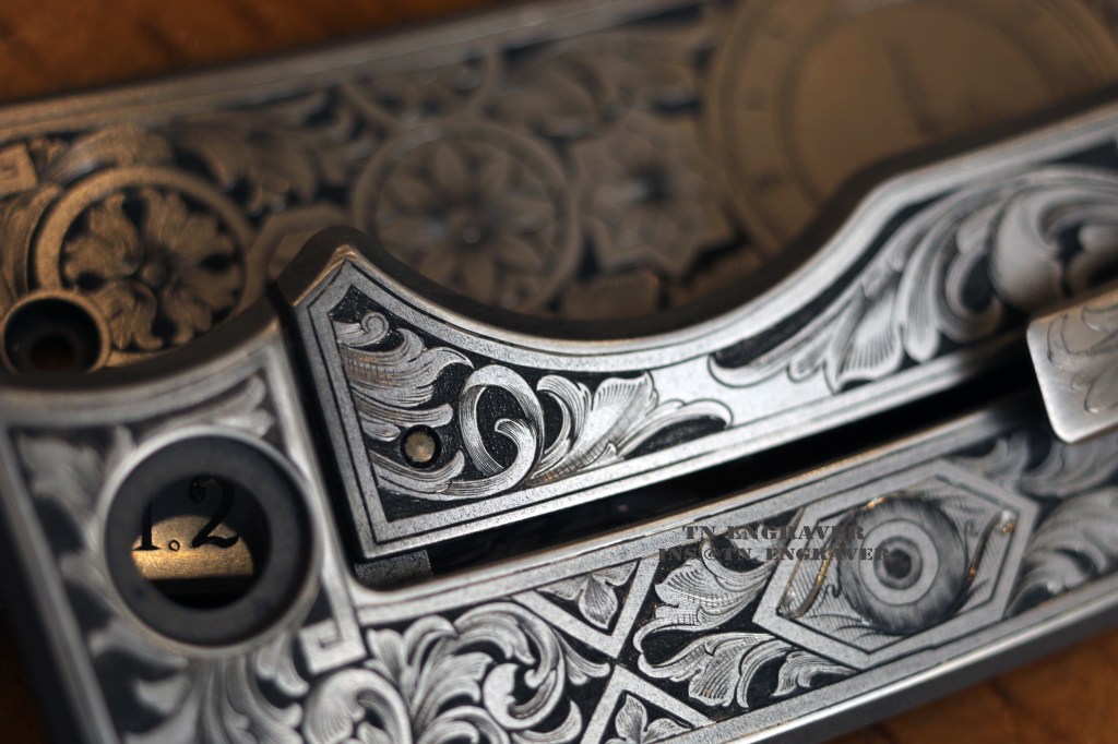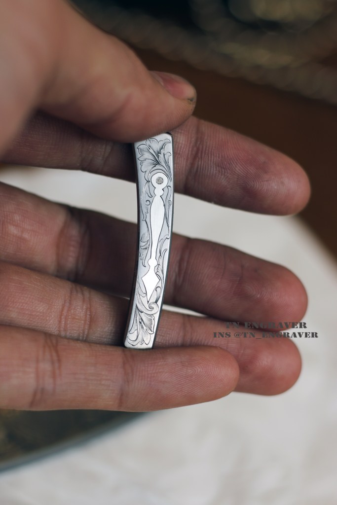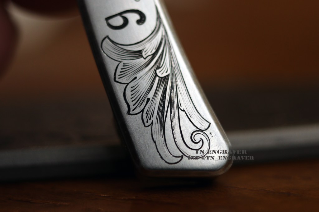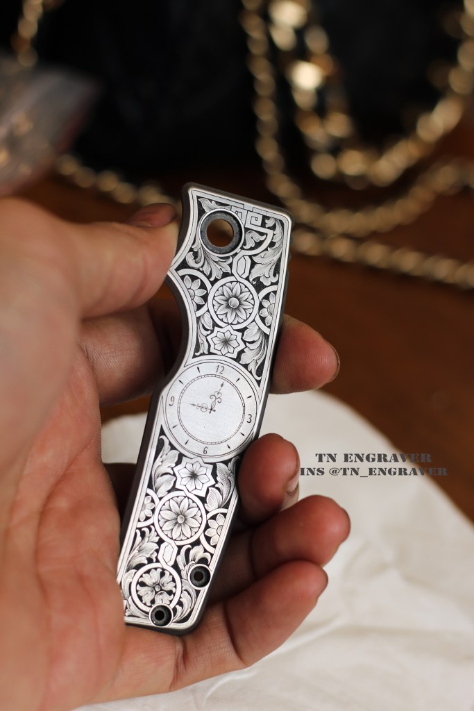 With the gracious permission of the true owner @sarasota_edc , I take great pride in presenting my latest engraving project. Collaborating with Mr. Wale has been a joyous journey throughout this project. The clock hands delicately point to a significant moment in his life. The ornate pattern, a fusion of black leaves and borders, is a manifestation of our shared creativity and imagination.