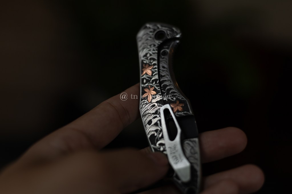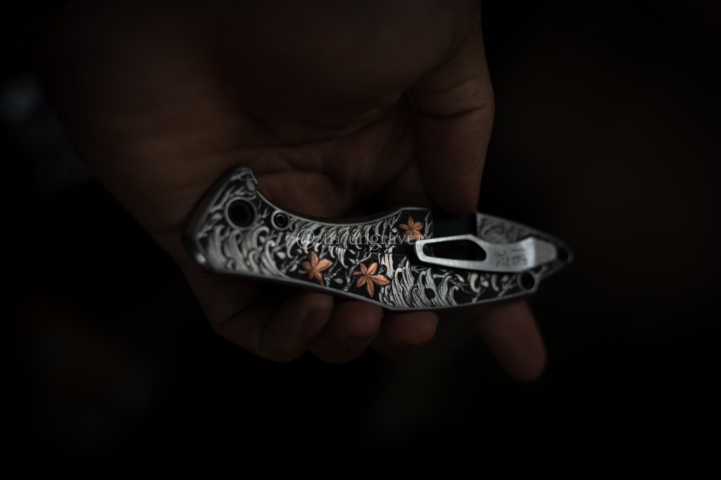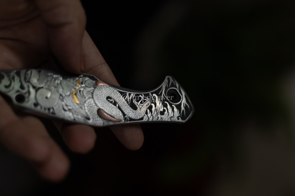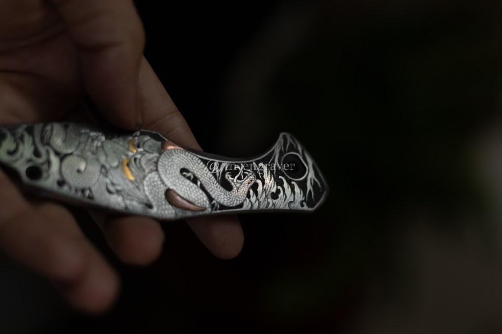 Introducing our custom hand-engraved, the original was Koenig folding knife with a durable DLC coating, Now it was featuring a deeply symbolic Japanese Oni mask theme. The Oni mask, representing the fearsome Japanese demons of folklore, symbolizes strength, protection, and the embodiment of malevolent forces. While traditionally seen as agents of chaos, Oni are also protectors against evil, acting as fierce guardians who ward off misfortune and bad spirits.